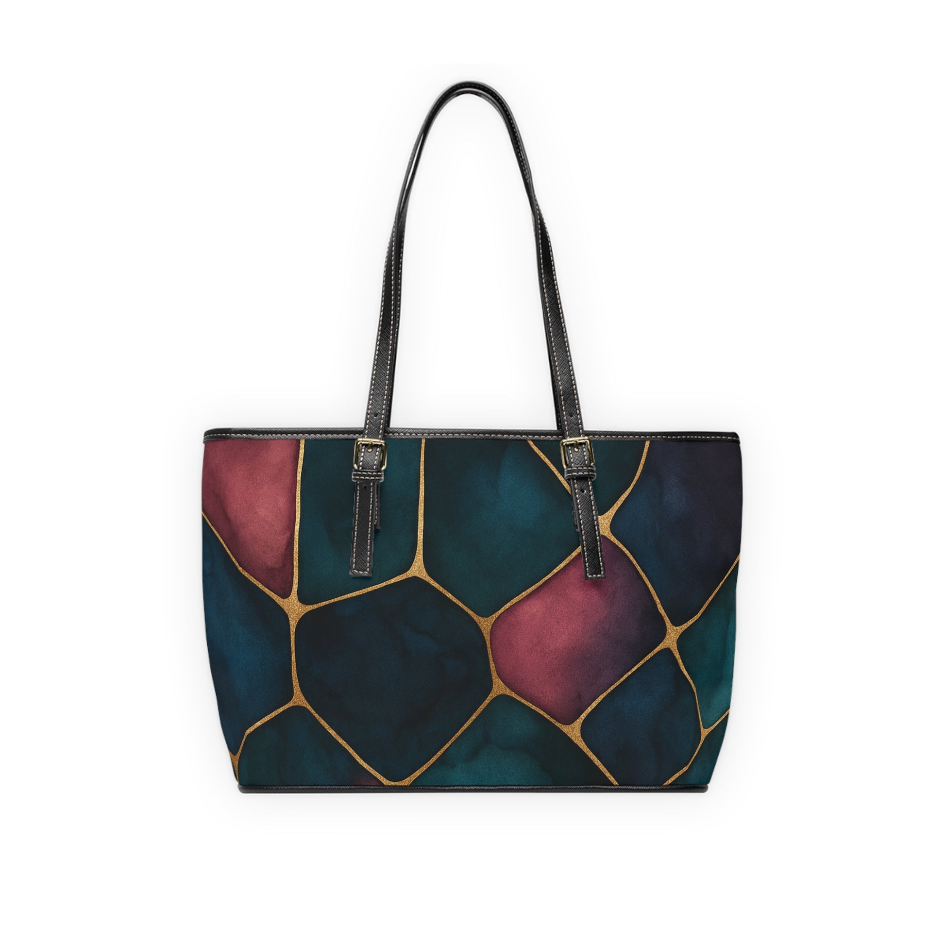 Abstract Stained Glass PU Leather Shoulder Bag — Teal & Wine Mosaic Tote