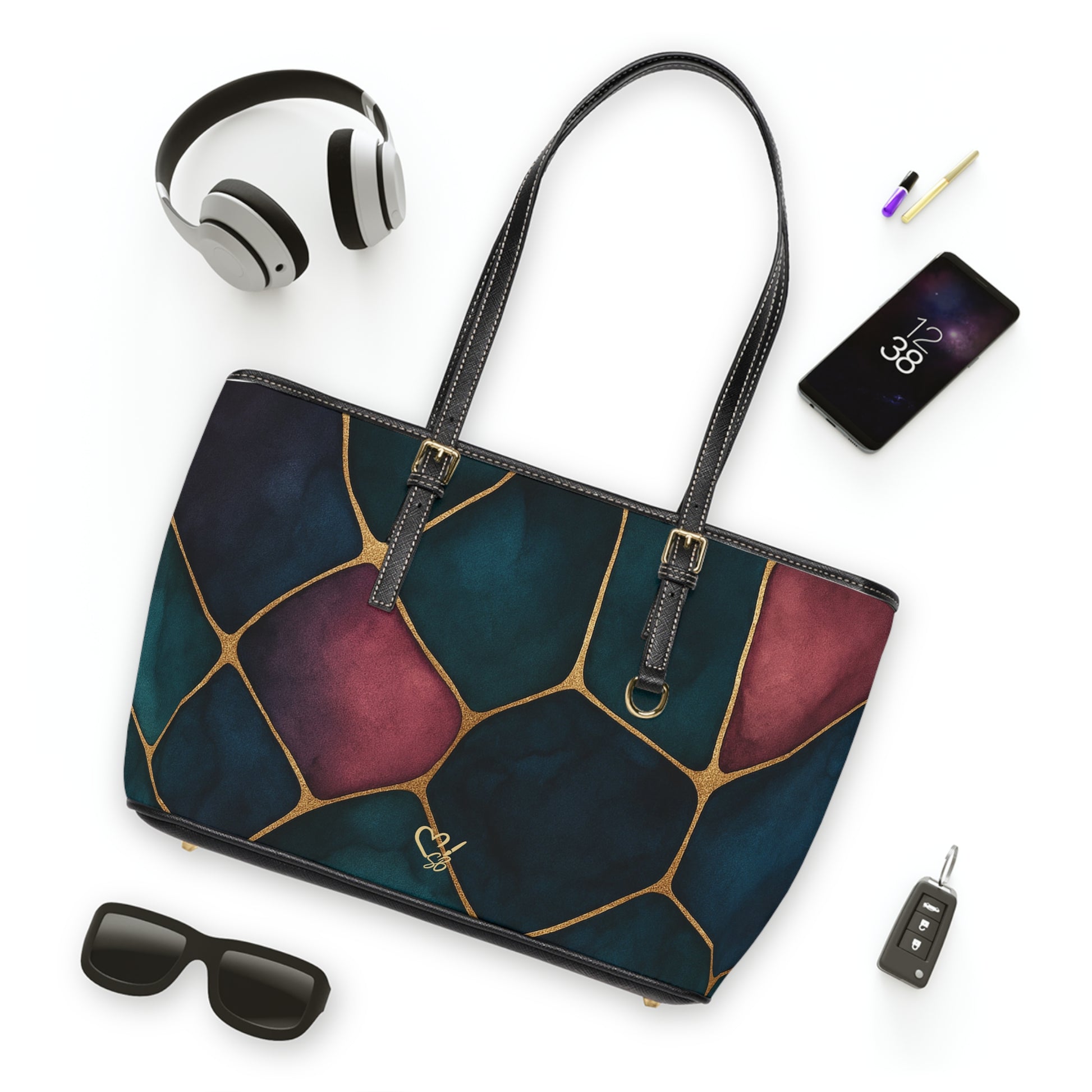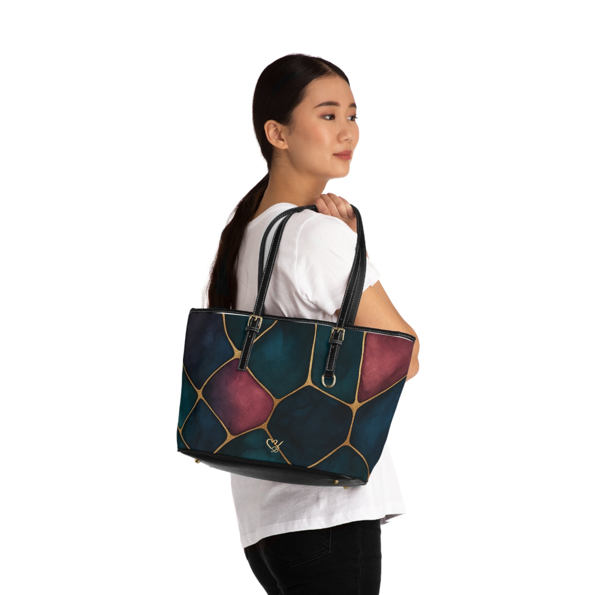 This elegant shoulder bag brings artful color and structure to everyday carry. Deep teal, indigo, and berry shapes are separated by soft gold lines, giving the surface the look of hand-painted stained glass. The pebble-like pattern reads both modern and timeless — it slips easily into workdays, gallery visits, and evenings out. Inside, a zip pocket and two open pockets keep essentials organized, while adjustable straps let you carry it over the shoulder or by hand. The gold-tone hardware and double-sided print complete a refined, polished presence that complements layered outfits and thoughtful accessories.