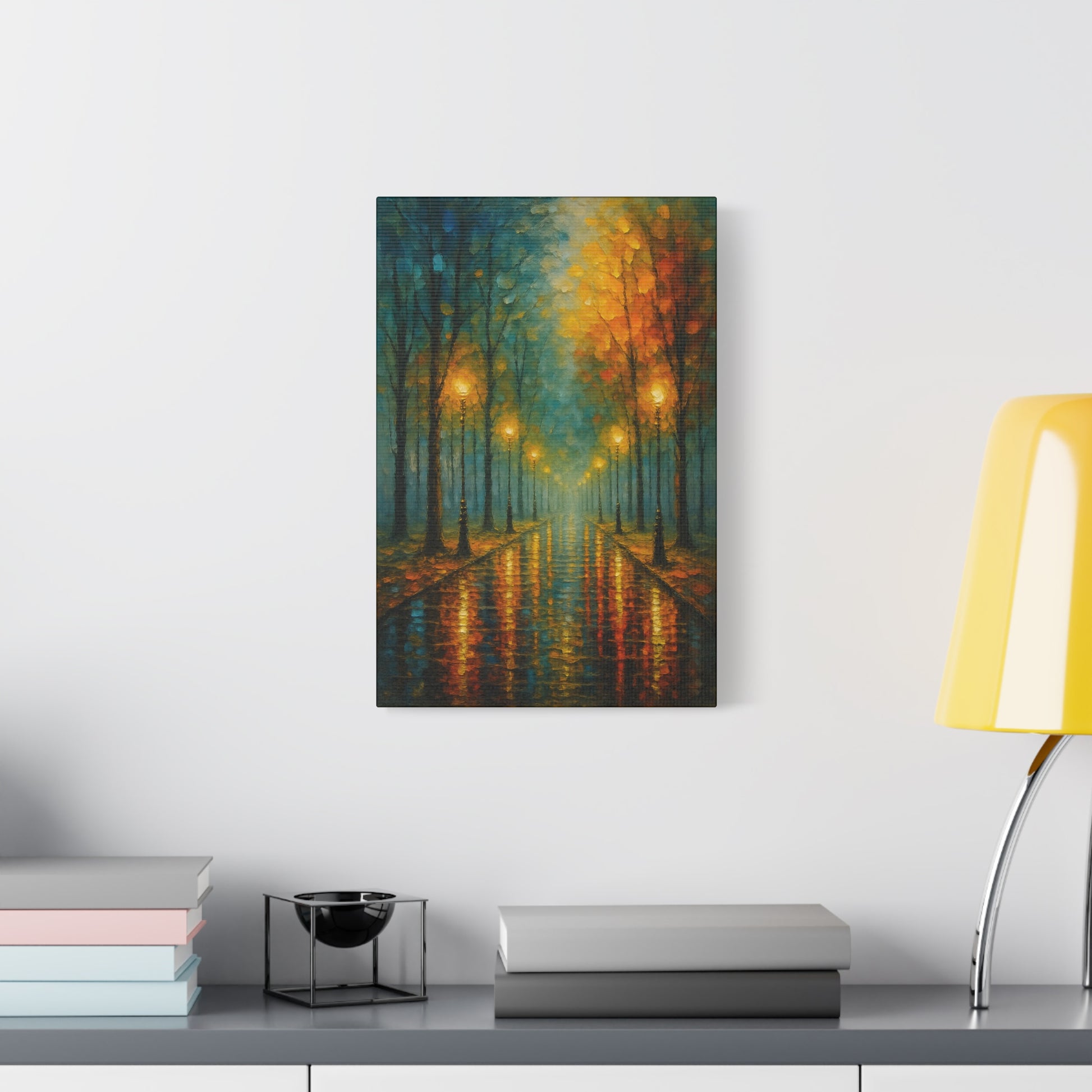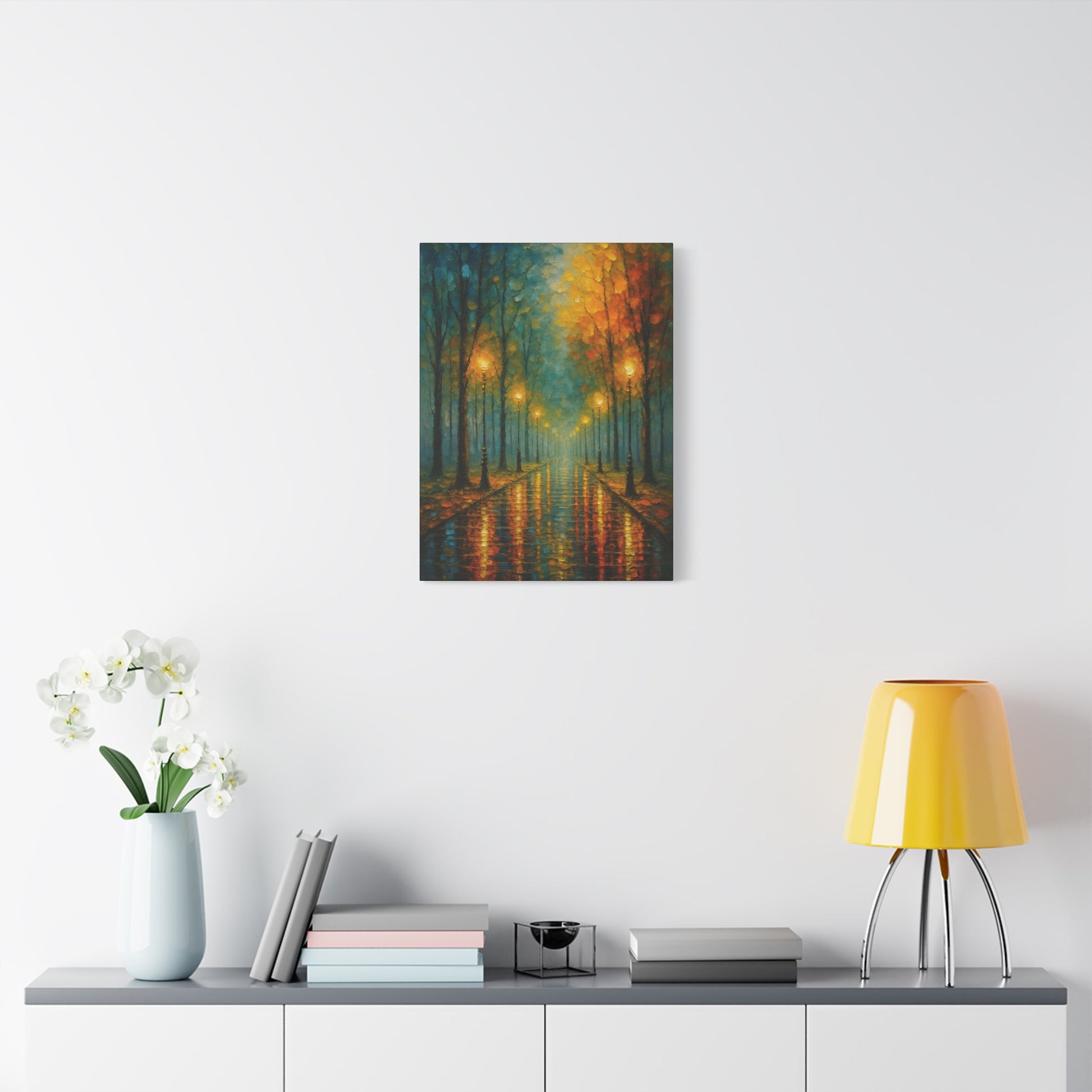 This piece reads like a memory: soft lamp halos, wet pavement reflections, and trees fading into a misty vanishing point. It fits into homes where atmosphere matters — layered lighting, textured fabrics, and intentional styling. Works beautifully for a cozy apartment entry, a calming bedroom vignette, or a living room where you collect moments that feel like stories.