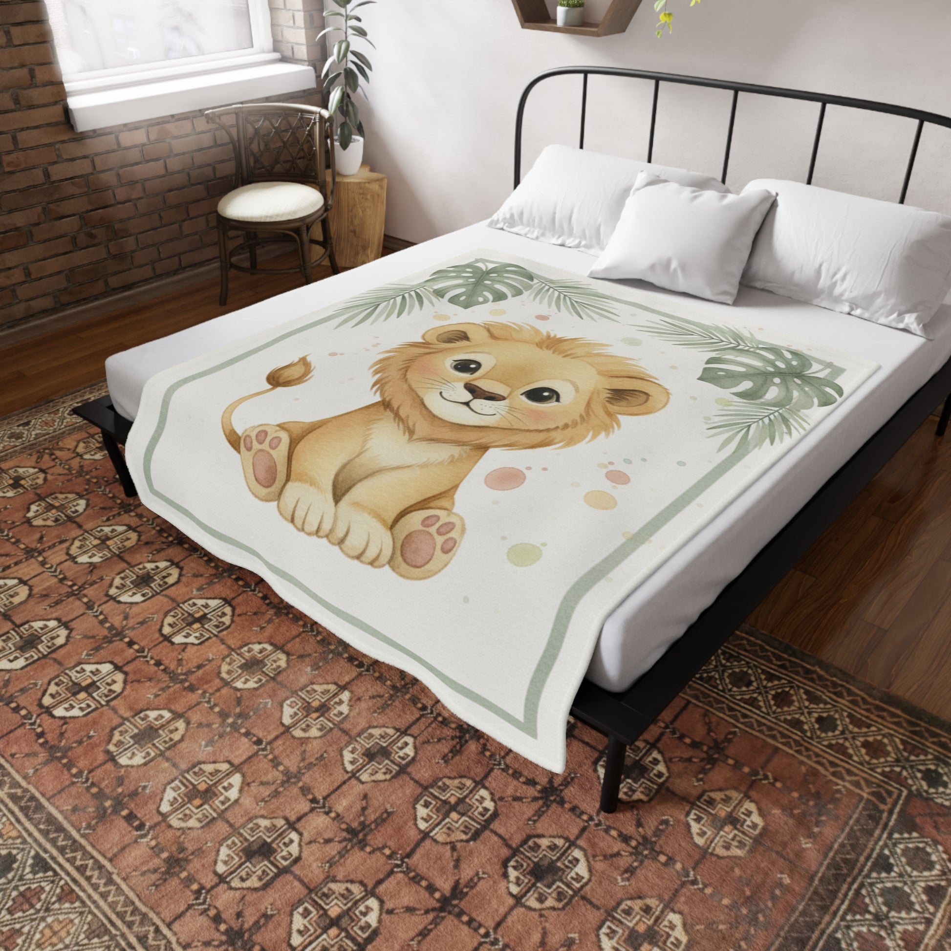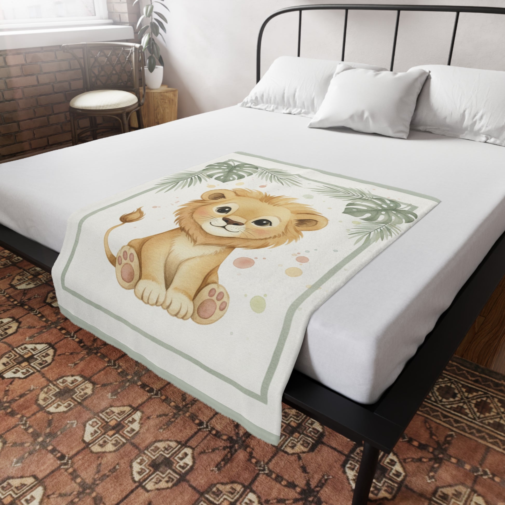 This velveteen plush blanket is the perfect addition to any Baby Lion themed nursery. This blanket is soft to the touch and lightweight, providing a comfortable and cozy feeling. Ideal for parents looking to complete their nursery decor with a matching blanket.
