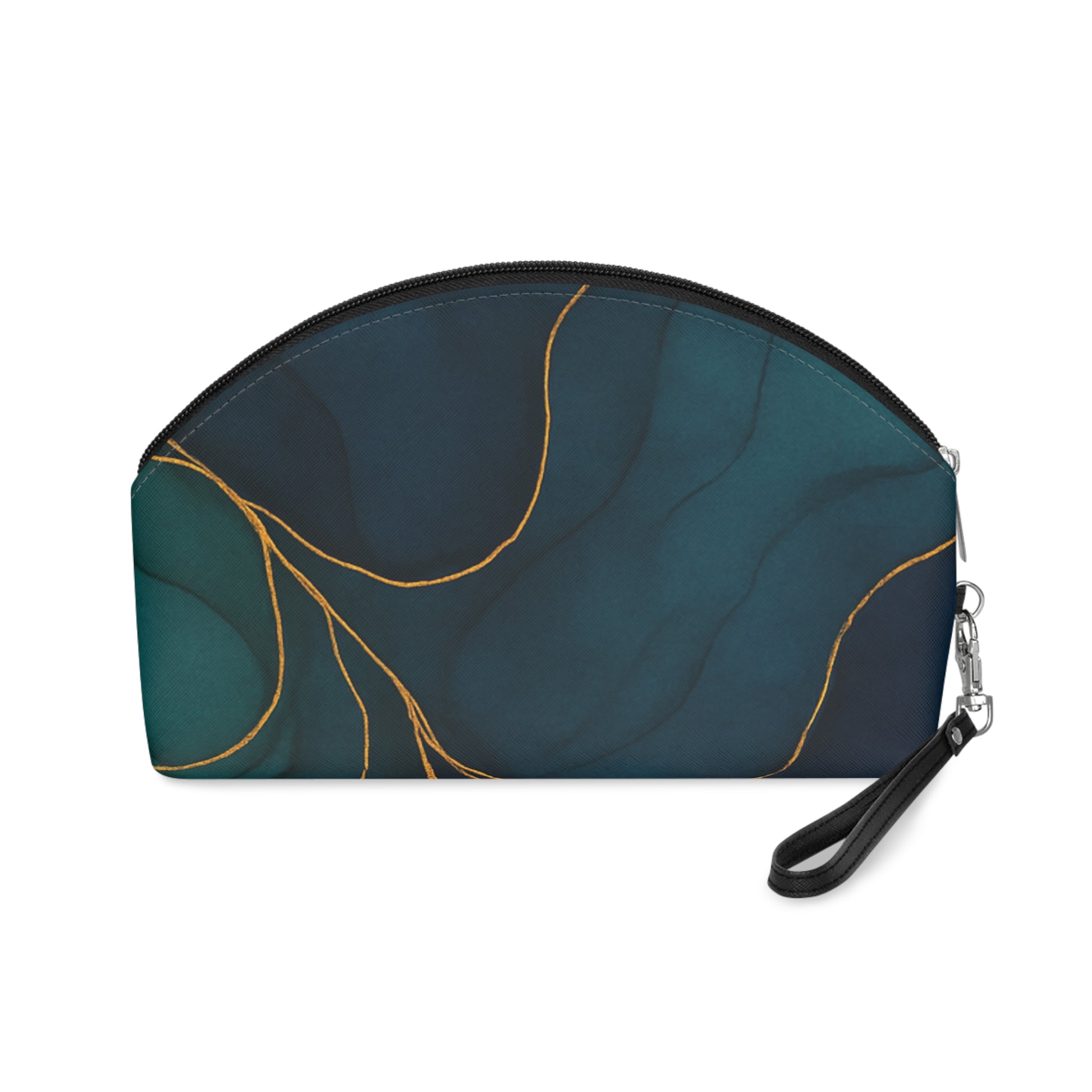 This curved makeup bag carries an artful quiet — deep teal and plum wash into one another, traced with soft gold lines like veins of light. Lightweight but structured, it slips into a tote or sits on your vanity without hogging space. The removable leather wrist strap makes it easy to grab on the go; inside, a single black compartment holds your everyday essentials: brushes, lipsticks, a compact, small perfume. The PU leather surface takes color brilliantly, so the rich tones and metallic accents keep their clarity through regular use. It’s the kind of pouch that calms a busy morning and elevates packing for a short trip.